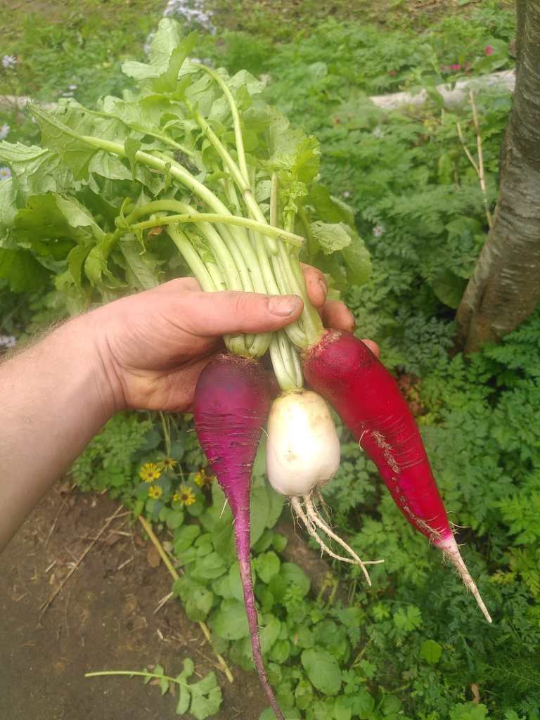 De hefrstraap is een brassica, of te wel familie van de kolen. Voor de komst van de aardappel was de raap de basis van veel menu’s. Nu is het een minder bekende groente. We telen drie rassen. Blauer Herbst und Winter (paars), Laurin (wit) en Ostergruß rosa 2 (rood).