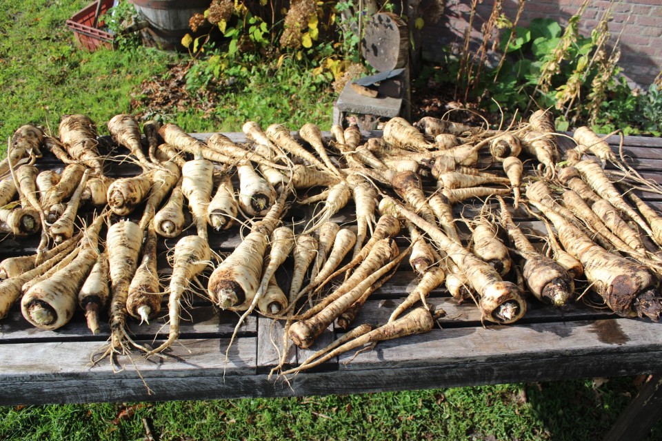 Vlak boven de grond vastpakken en dan uit de grond trekken. Lukt dat niet, gebruik dan een riek. Zorg dat er geen resten van de pastinaak in de grond achterblijven. Bij zonnig weer ervoor zorgen dat je armen bedekt blijven tijdens het oogsten. Het blad van de pastinaak kan een allergische reactie veroorzaken.