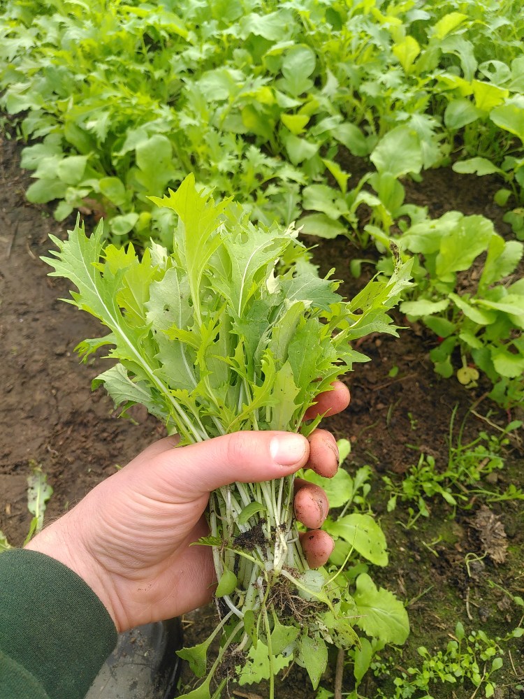 Pak een bosje raapstelen vast en trek die in z’n geheel (met wortel en al) uit de grond. Bij het bed staat een emmer water waarin je de wortels kan afspoelen. Als je de raapsteel thuis in het water zet blijft ze langer vers.