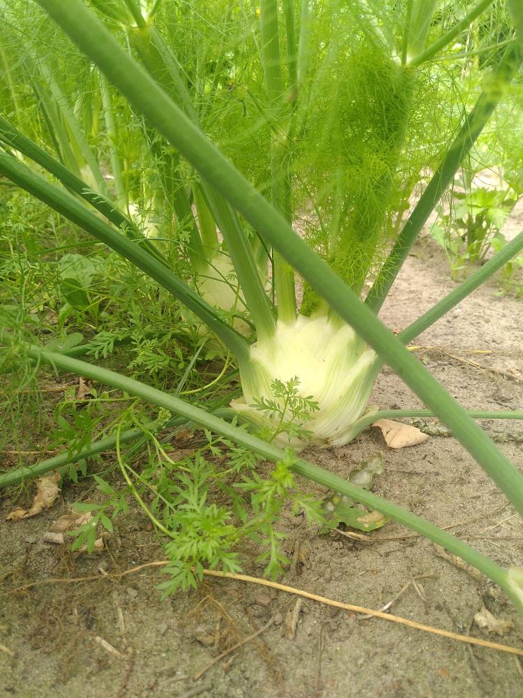 Knolvenkel wordt ook wel bolvenkel genoemd. Hij wordt gevormd door een aantal brede, van onderen verdikte, bladstelen. Nadat we de knolvenkel geplant hebben zie je enkele dagen een plantje plat op de grond liggen. Dat ziet er kwetsbaar uit. Ik ben altijd blij als ze rechtop zijn gaan staan. Naast de knolvenkel is er ook nog het kruid venkel, dat voor blad en zaden wordt gekweekt en niet geschikt is voor de teelt van de bol.